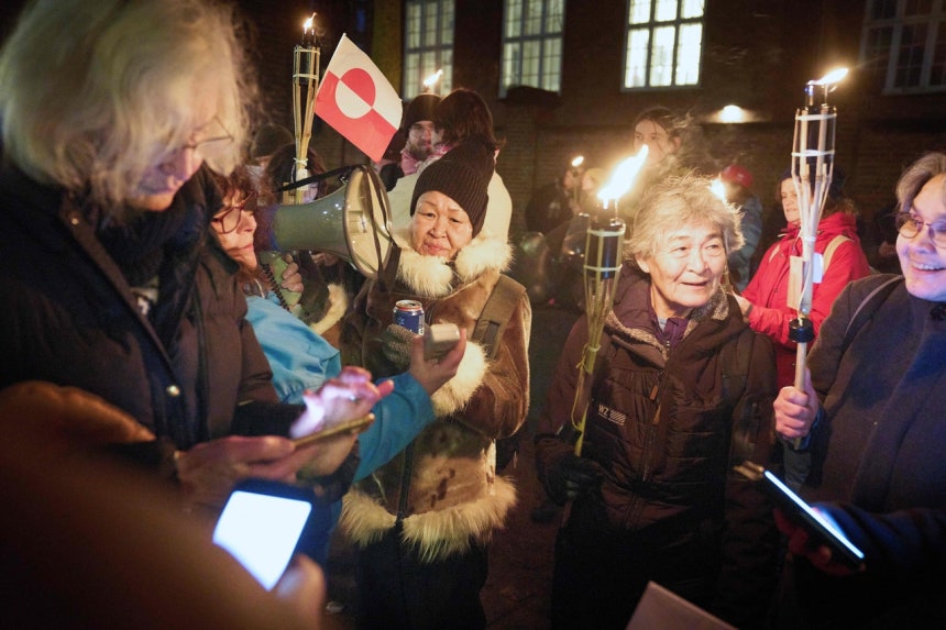 14ÀÏ(ÇöÁö½Ã°£) µ§¸¶Å© ÄÚÆæÇϰտ¡ ÀÖ´Â ¹Ì±¹ ´ë»ç°ü ¾Õ¿¡¼­ ±×¸°¶õµå ±¹±â¿Í ȶºÒÀ» µç ½Ã¹ÎµéÀÌ ¡°±×¸°¶õµå´Â ±×¸°¶õµåÀÎÀÇ °Í¡±À̶ó´Â ±¸È£ ¾Æ·¡ ½ÃÀ§¸¦ ¹úÀ̰í ÀÖ´Ù.[AFP]